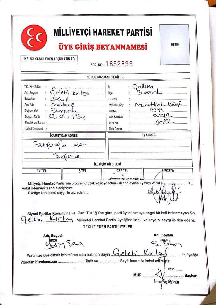 İlçe Seçim Müdürlüğüne İYİ Parti’den istifa ettiğine dair dilekçe veren Çelebi Kırtay, daha sonra MHP İlçe Teşkilatına giderek üye oldu. Kırtay, MHP İlçe Başkanı Yasin Şahin’e üye kayıt dilekçesini verdi. Yasin Şahin, MHP’ye katılan Çelebi Kırtay’ı tebrik etti.