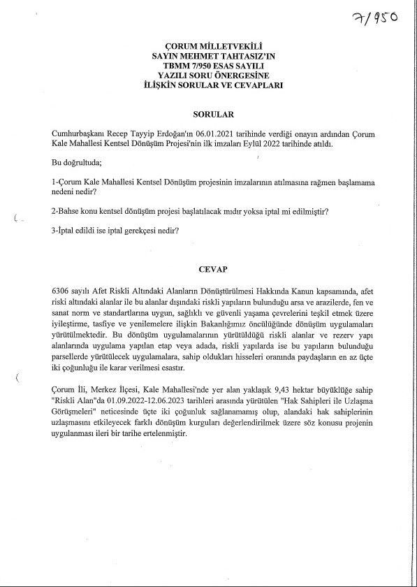 Cumhuriyet Halk Partisi (CHP) Çorum Milletvekili Mehmet Tahtasız’ın Kale Mahallesi Kentsel Dönüşüm Projesi’nin ne zaman tamamlanacağına ilişkin verdiği önergeye Çevre, Şehircilik ve İklim Değişikliği Bakanlığı’ndan yanıt geldi. Bakanlıktan gelen yanıta göre hak sahipleri ile uzlaşma görüşmeleri neticesinde üçte iki çoğunluk sağlanamadığından projenin ileri bir tarihe ertelendiği ifade edildi.