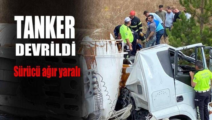 Çorum’da kontrolden çıkarak devrilen tankerin sürücü ağır yaralandı.