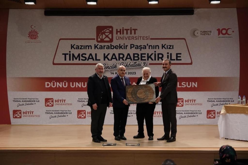 Hitit Üniversitesi tarafından düzenlenen 7. Gençlik Sohbetleri çerçevesinde Kazım Karabekir Paşa’nın kızı Timsal Karabekir, “Dünü Unutma Yarına Hakkın Olsun” konulu bir Konferans verdi. Meslek Yüksek Okulu Ethem Erkoç Konferans Salonu’nda gerçekleştirilen programda Timsal Karabekir, babası ve görevde olduğu sürece yaşanan olaylar hakkında bilinmeyenleri anlattı. Gençlerin omuzlarında büyük mesuliyetler olduğunu vurgulayan Karabekir, “Severek ve dik durarak, ‘Cihan yıkılsa Türk yılmaz’ diyeceksiniz. Yılmak yok. Her zaman vatanınız, ezanınız, bayrağınız için daima canlı olacaksınız. Ben 83 yaşımdayım, emeklilik bilmiyorum. Beşikten mezara kadar Cumhuriyetimize hizmet etmek borcumuzdur, görevimizdir” şeklinde konuştu.