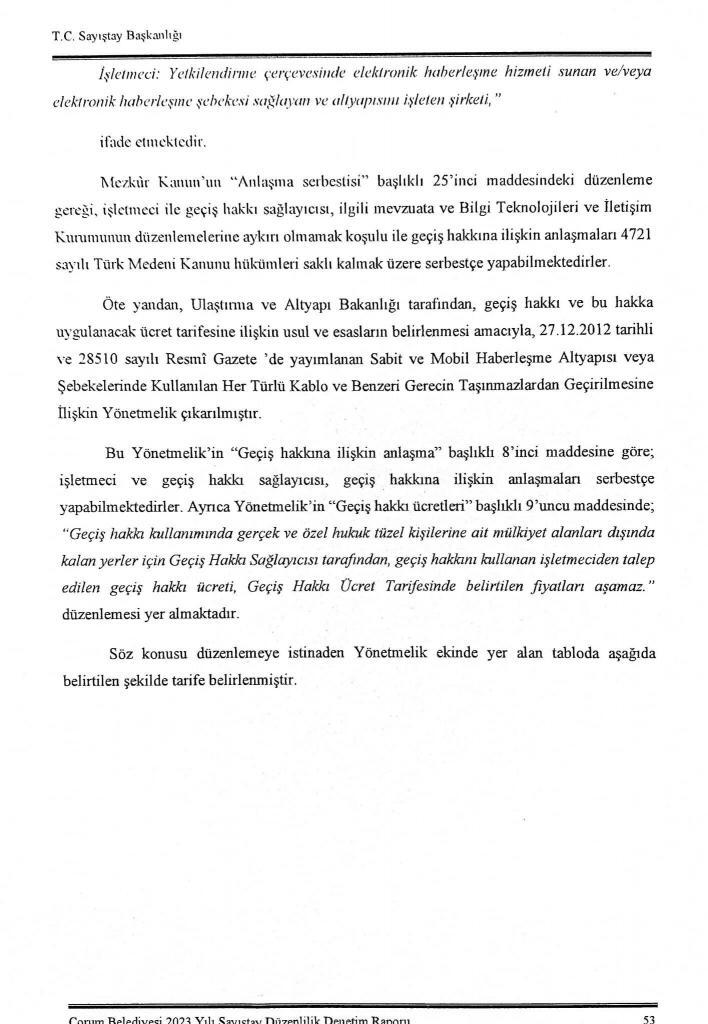 CHP Belediye Meclisi Üyesi Erkan Özbal da, Sayıştay’ın Çorum Belediyesi ile ilgili 2023 yılı denetim raporunda Telekomünikasyon altyapı ve şebekelerinden alınması gereken geçiş hakkı bedellerinin tahsilatının yapılmaması’ şeklinde yer alan tespitlere dikkat çekti: