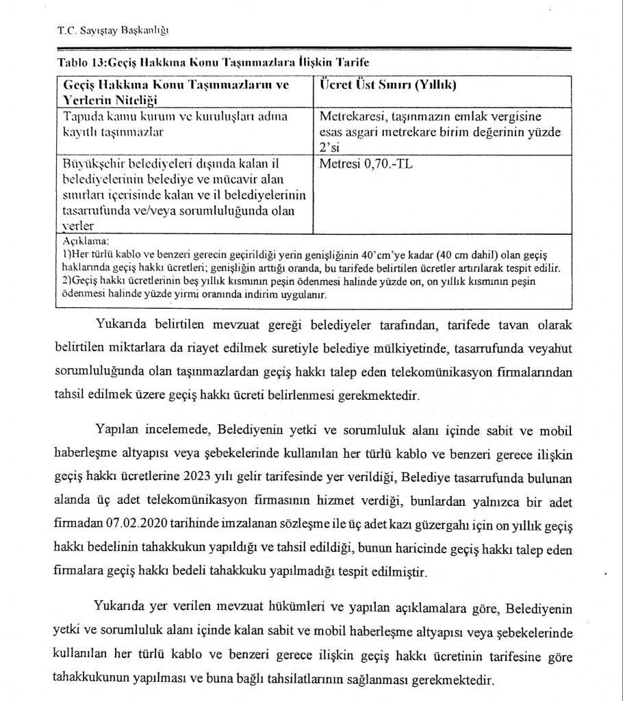 İlgili Sayıştay raporu maddesinde yer alan tespite de dikkat çeken Erkan Özbal, ‘Belediyenin yetki ve sorumluluk alanı içinde kalan sabit ve mobil haberleşme altyapısı veya şebekelerinde kullanılan her türlü kablo ve benzeri gerece ilişkin geçiş hakkı ücretlerine belediye gelir tarifesinde yer verildiği ancak söz konusu gelir kaleminin takip ve tahsilatının yapılmadığı görülmüştür.’ ifadesine yer verdi.