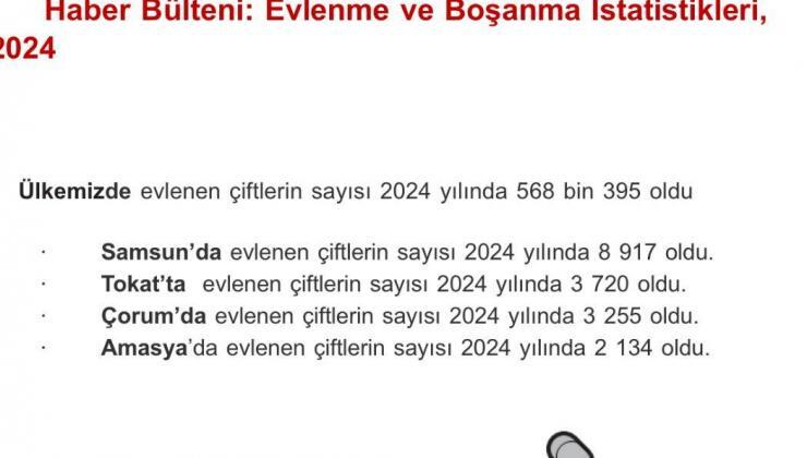 Toplam evlenmeler içinde yabancı kişiler ile evlenmeler incelendiğinde, yabancı damatların sayısı 2024 yılında 5 bin 923 olup toplam damatların %1,0’ını oluştururken yabancı gelinlerin sayısı 29 bin 115 olup toplam gelinlerin %5,1’ini oluşturdu.