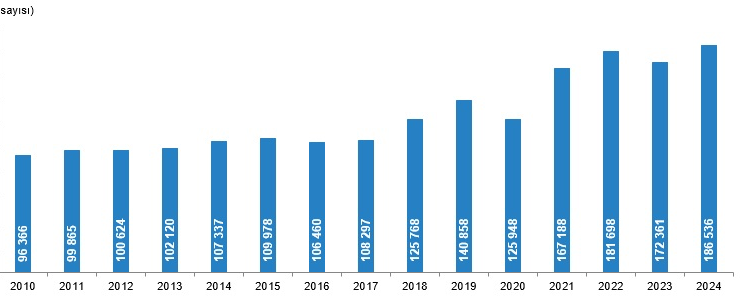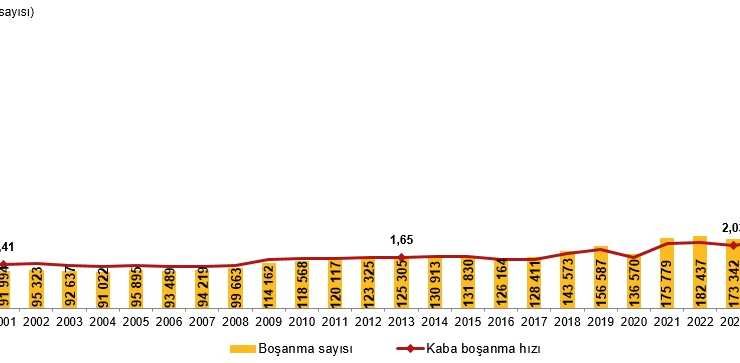Boşanan çiftlerin sayısı 2023 yılında 173 bin 342 iken 2024 yılında 187 bin 343 oldu. Bin nüfus başına düşen boşanma sayısını ifade eden kaba boşanma hızı 2024 yılında binde 2,19 olarak gerçekleşti.