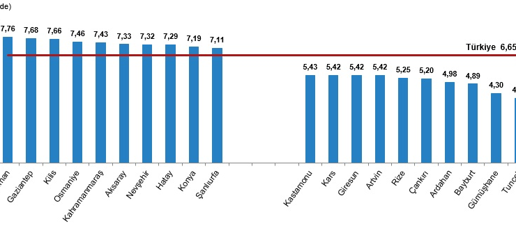 Kaba evlenme hızının 2024 yılında en yüksek olduğu il, binde 7,76 ile Adıyaman oldu. Bu ili binde 7,68 ile Gaziantep, binde 7,66 ile Kilis izledi. Kaba evlenme hızının en düşük olduğu il ise binde 4,01 ile Tunceli oldu. Bu ili binde 4,30 ile Gümüşhane, binde 4,89 ile Bayburt izledi.