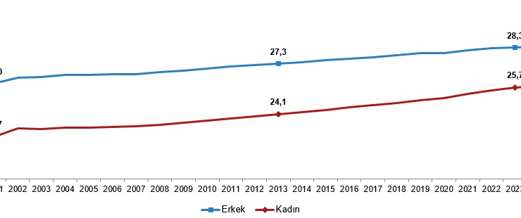 Cinsiyete göre ortalama ilk evlenme yaşı, 2001-2024