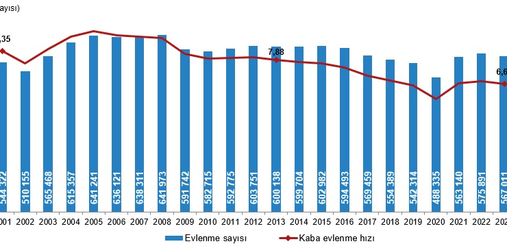 Yıllara göre ortalama ilk evlenme yaşı incelendiğinde, her iki cinsiyette de ilk evlenme yaşının arttığı görüldü. Ortalama ilk evlenme yaşı 2024 yılında erkeklerde 28,3 iken kadınlarda 25,8 oldu. Erkek ile kadın arasındaki ortalama ilk evlenme yaş farkı ise 2,5 yaş olarak gerçekleşti.